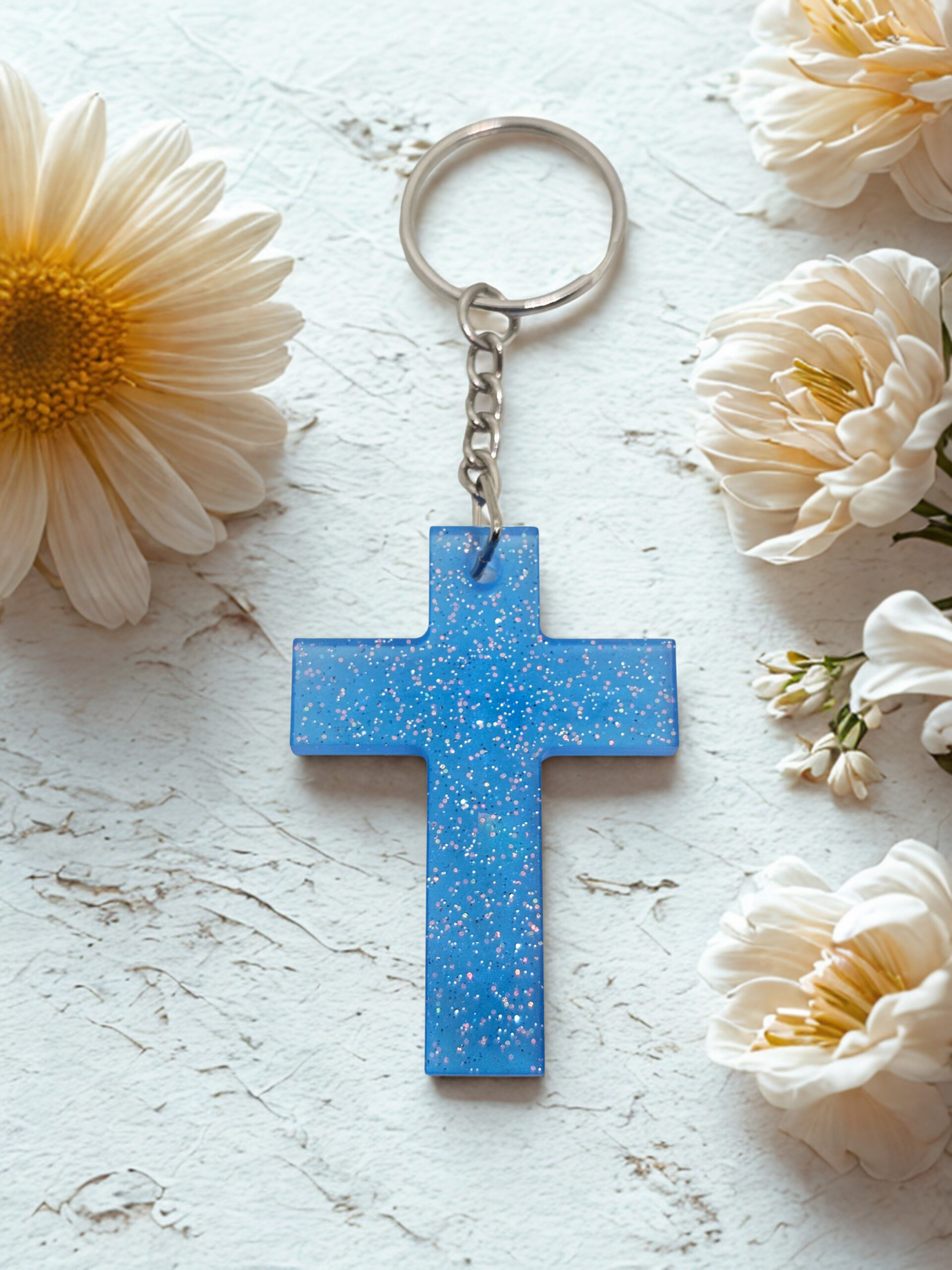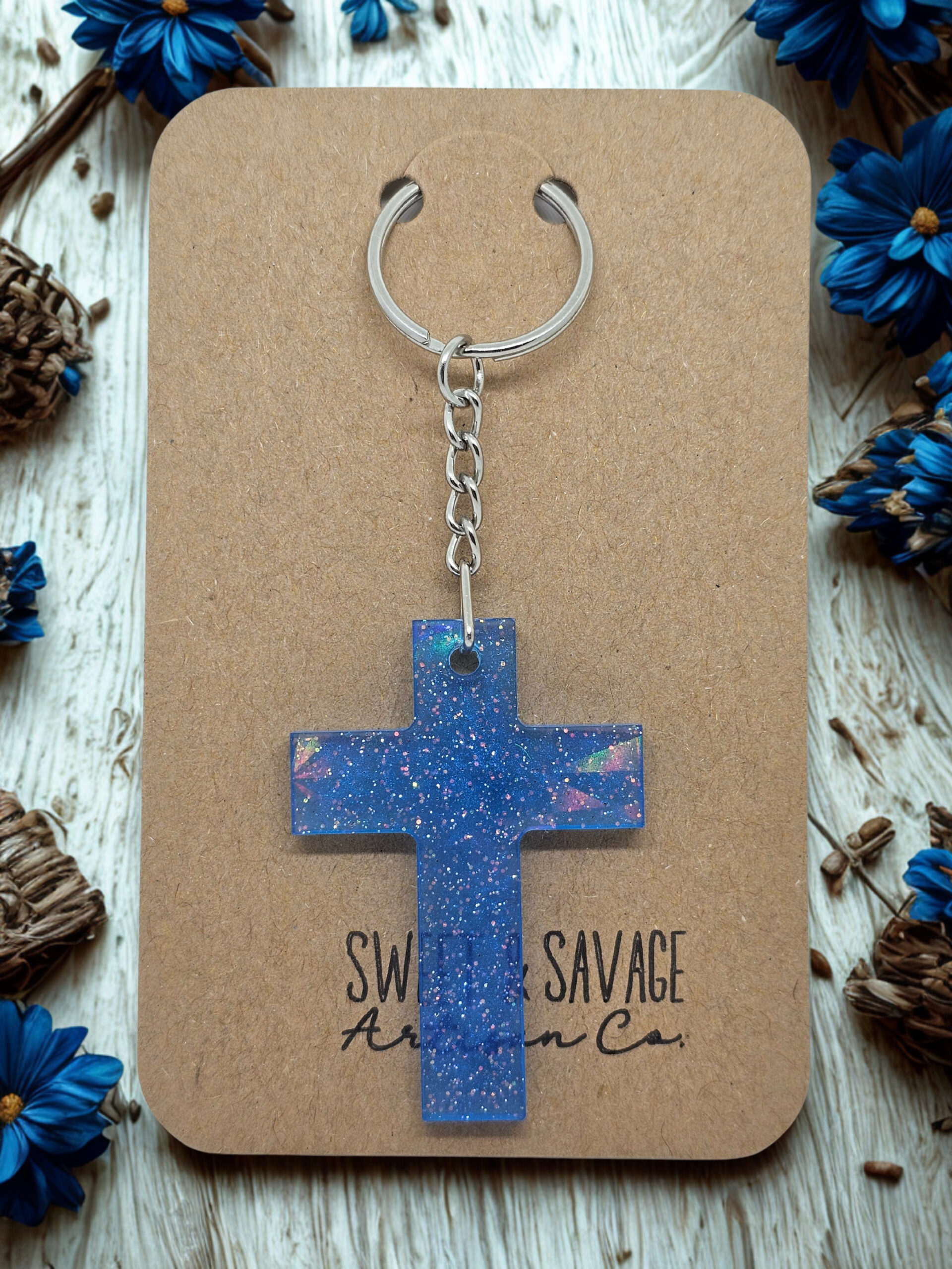 Carry a little sparkle and encouragement with you wherever you go. This handmade holographic cross keychain features a rich blue resin filled with shimmer, soft glitter, and flashes of color that catch the light beautifully.