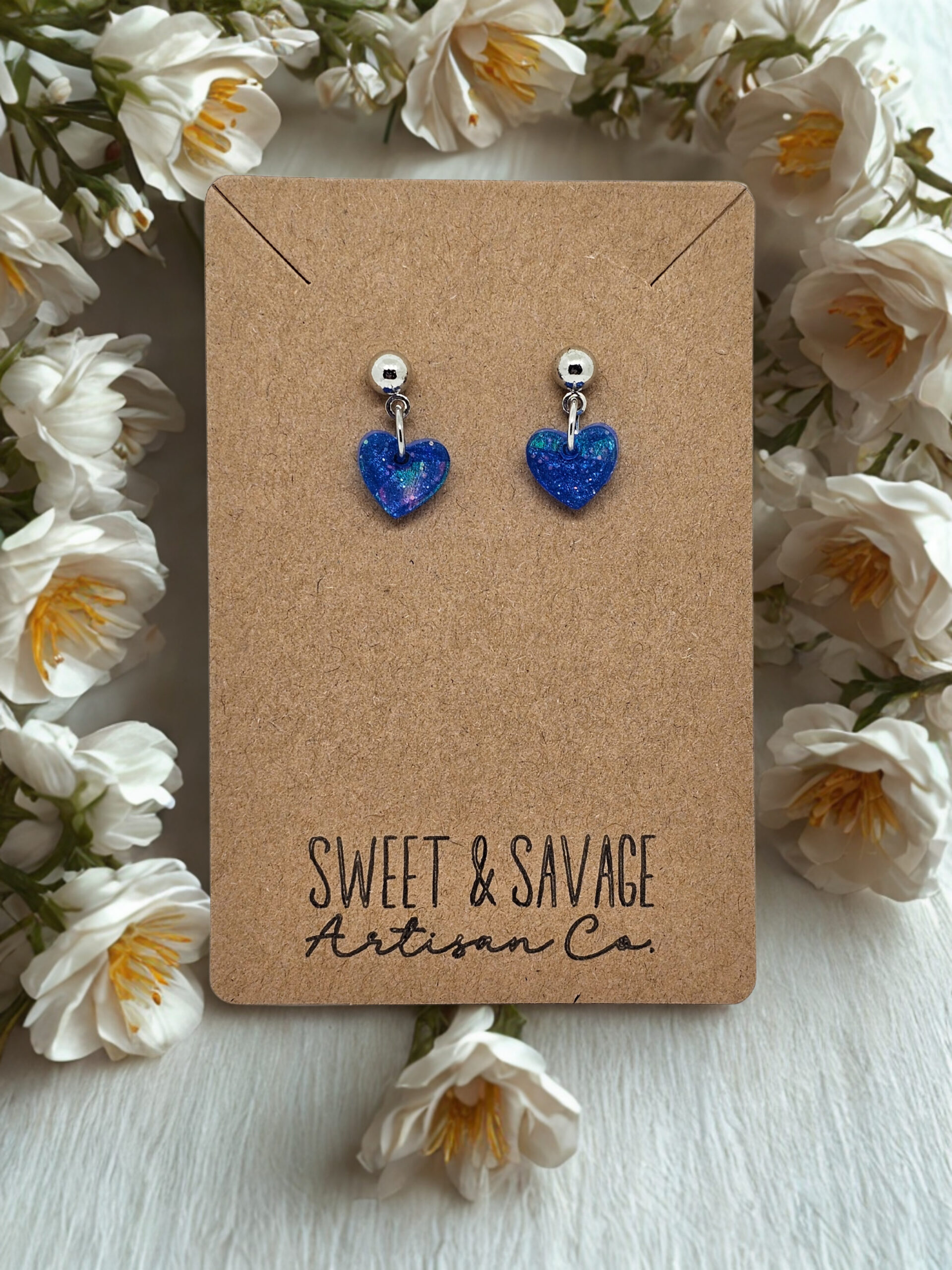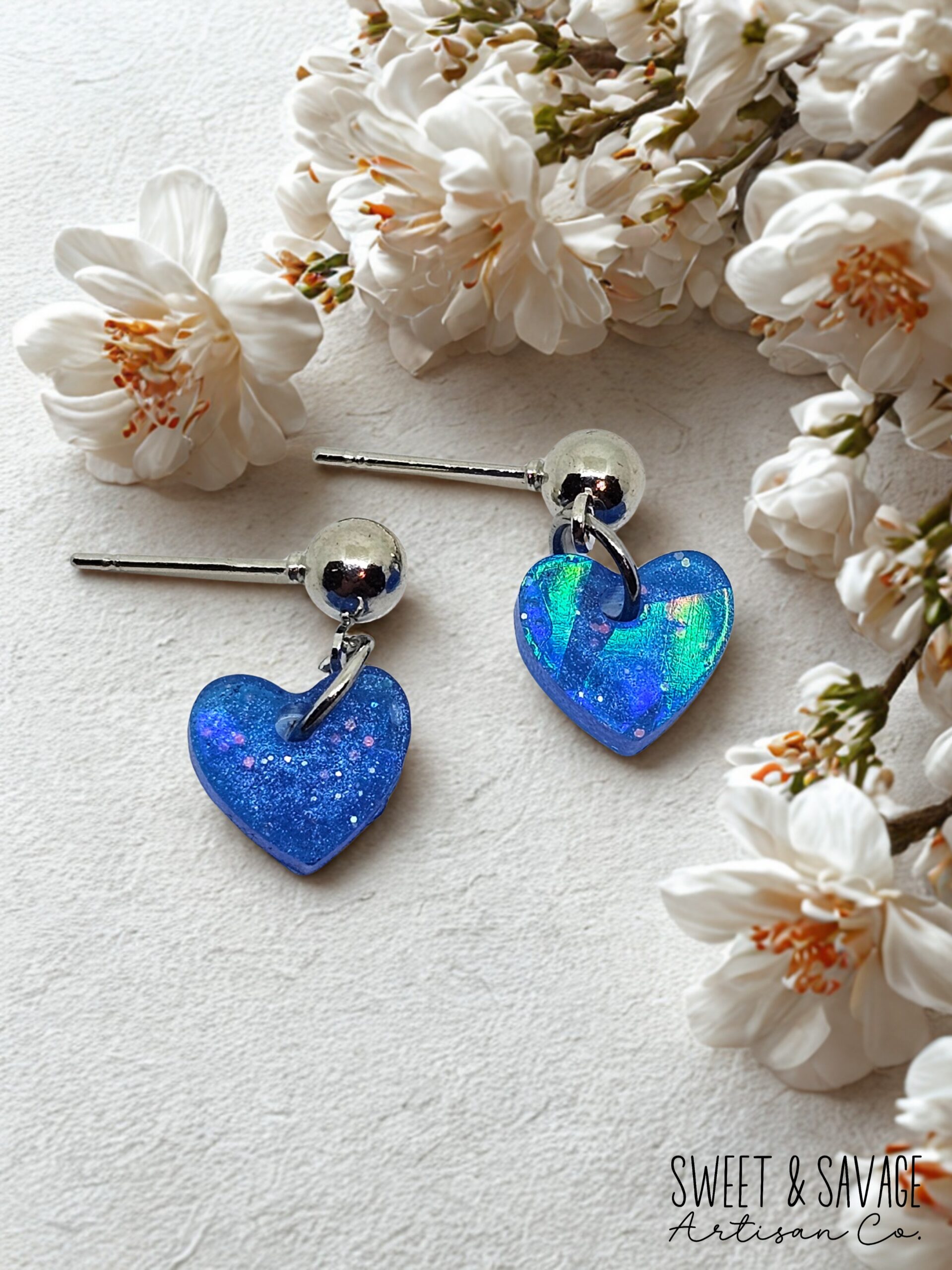Fall in love with these mesmerizing blue iridescent heart dangle stud earrings. Handcrafted from resin and finished with a dreamy galaxy-inspired shimmer, each heart catches the light with hints of teal, sapphire, and soft sparkle.