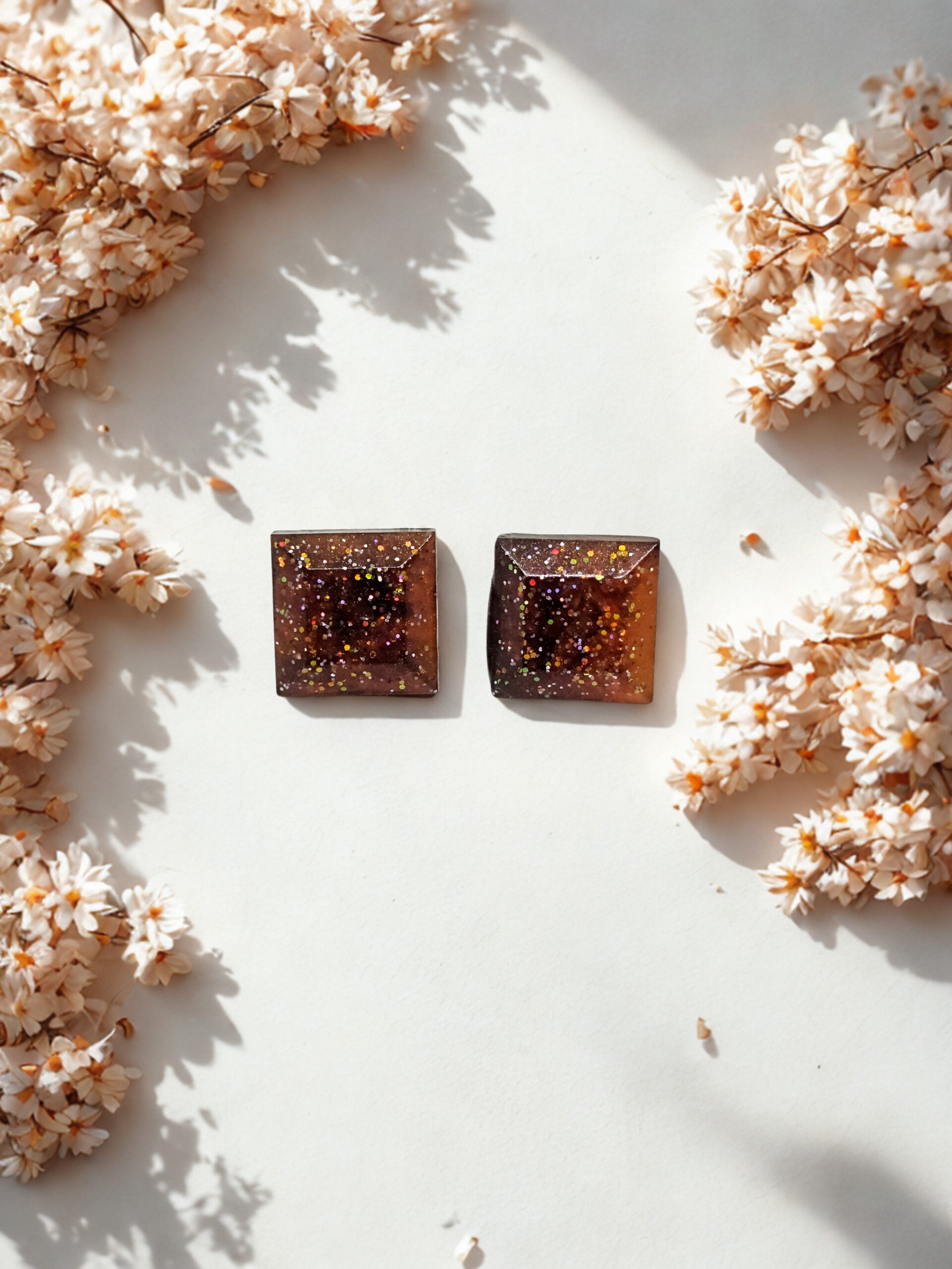 These brown-orange resin gem studs add a bold pop of color with their sleek square shape and glossy finish.