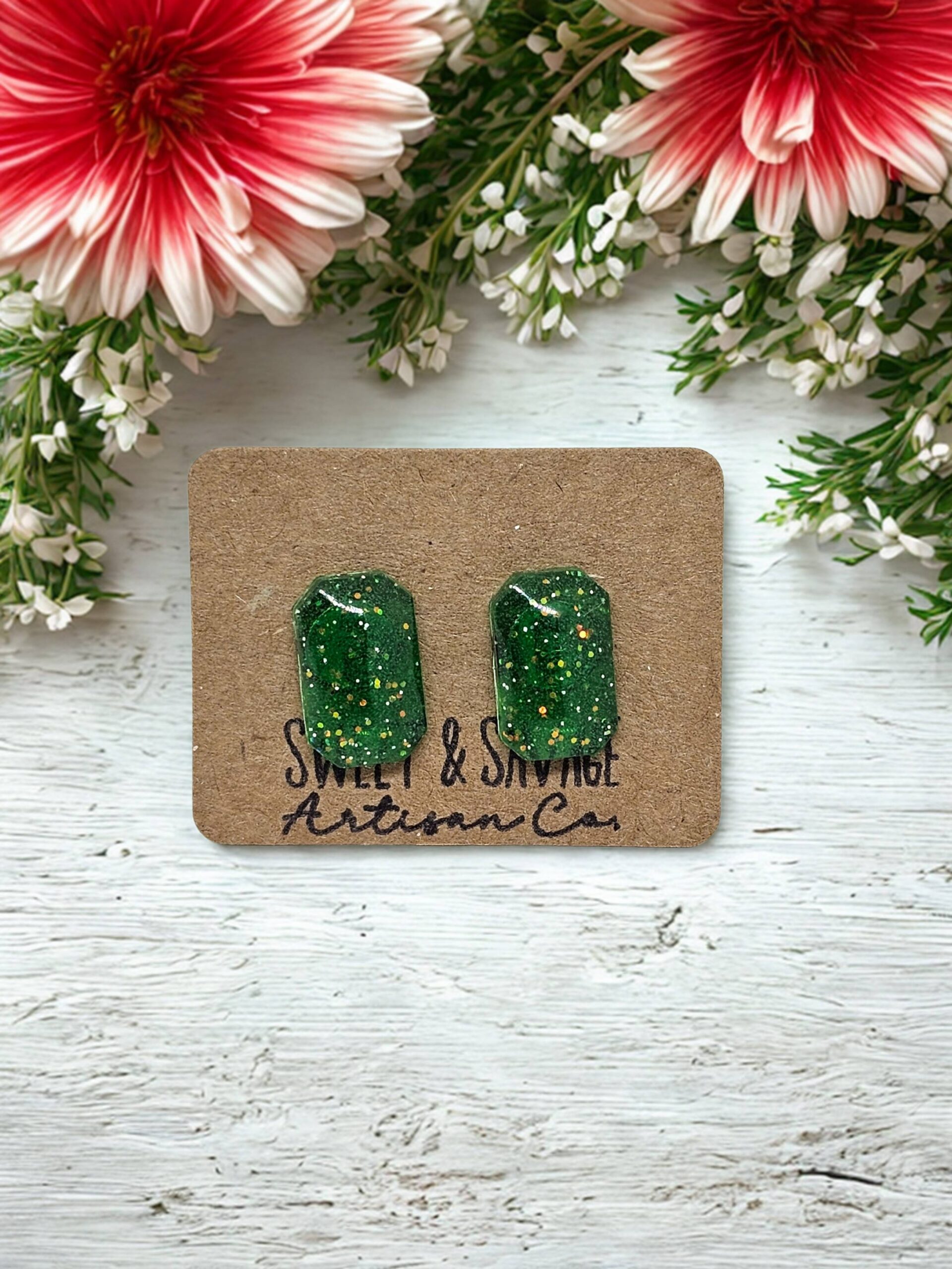 These emerald green resin gem studs add a bold pop of color with their sleek squircle shape and glossy finish.