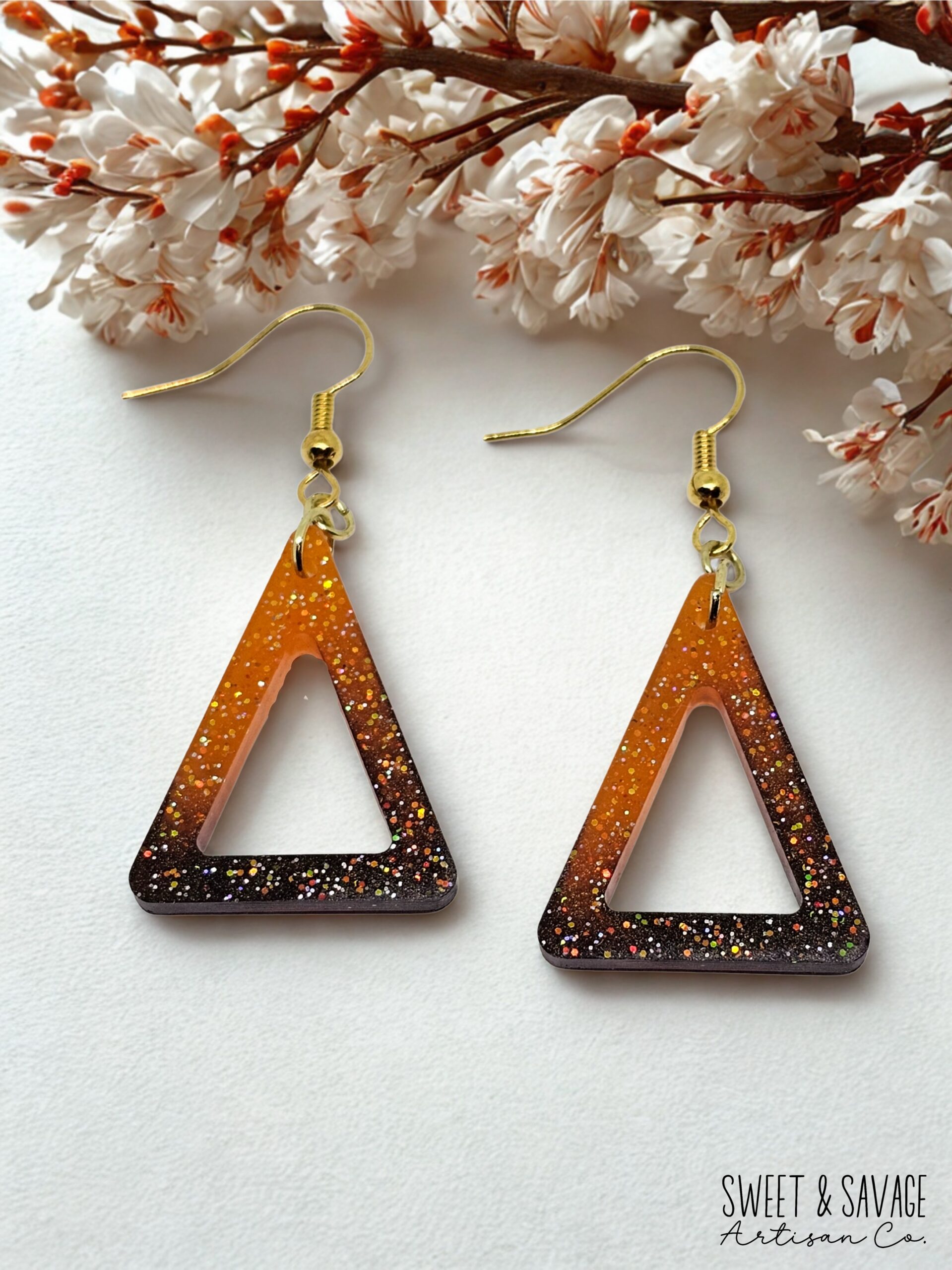 Make a bold geometric statement with these eye-catching triangle dangle earrings from Sweet & Savage Artisan Co. These stunning pieces feature a captivating ombre effect that transitions from deep brown to vibrant orange, enhanced with sparkling glitter that catches the light beautifully.