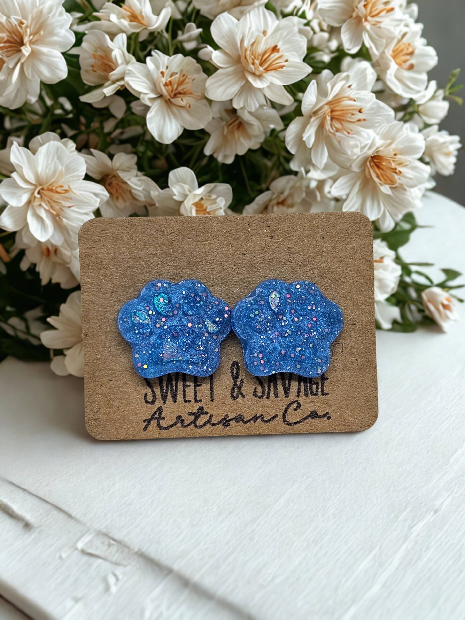 Handmade paw print stud earrings with glitter and holographic accents. Gorgeous medium blue color that would be perfect for everyday wear.