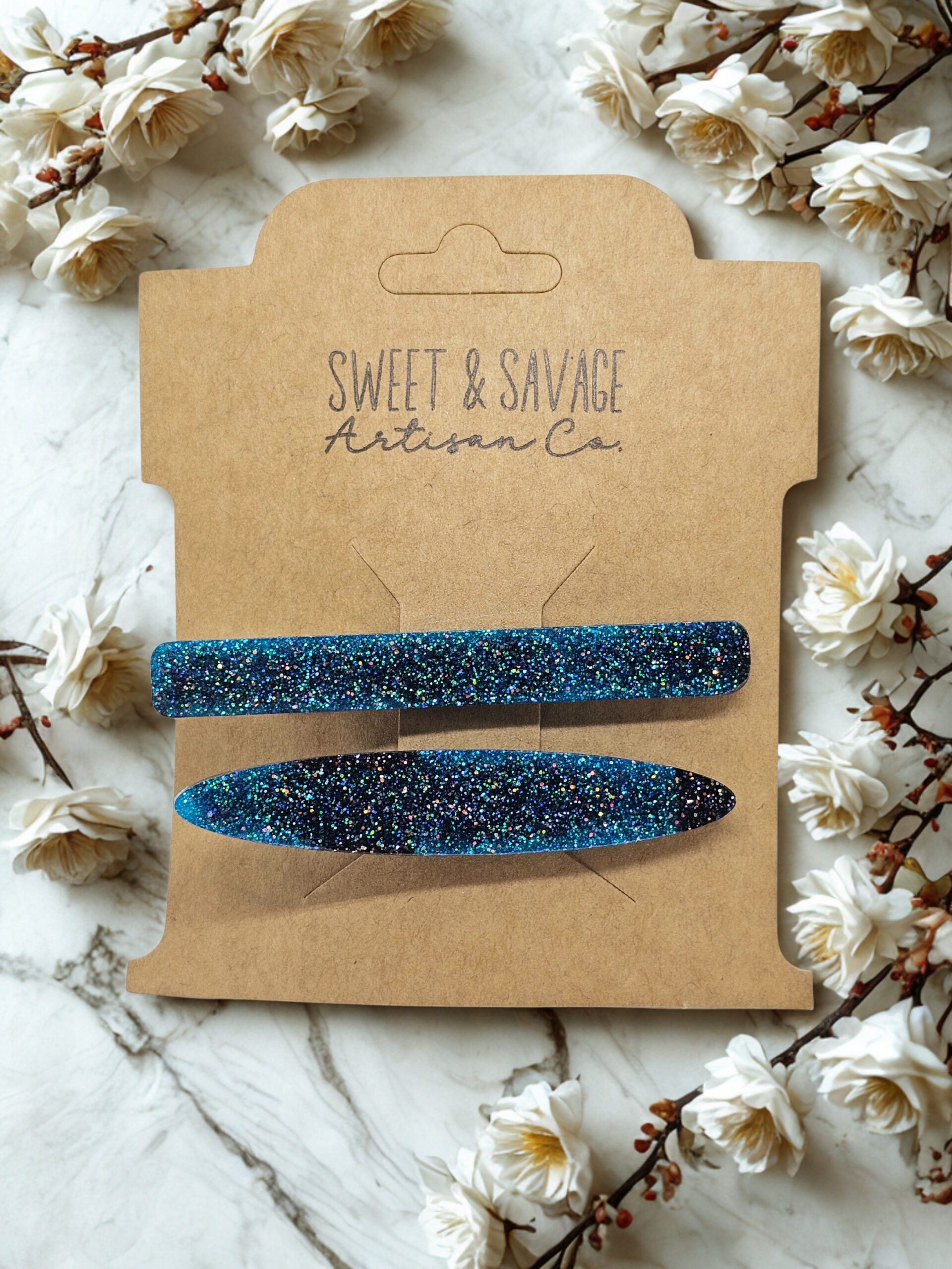 Add a bold pop of sparkle to your everyday style with our Midnight Blue Glitter Hair Clip Set. This dazzling duo features a rich blue base with multi-dimensional glitter that catches the light beautifully from every angle.