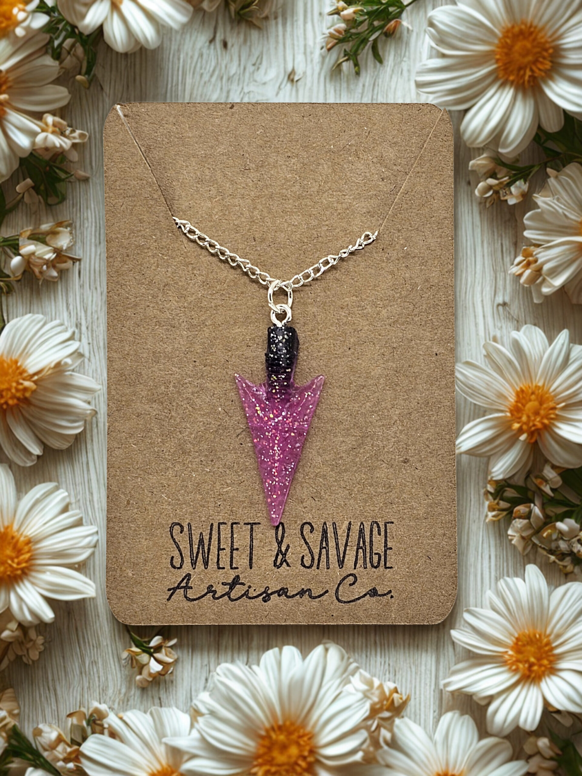 Turn heads with this pink and black arrowhead necklace, a bold statement piece that blends feminine charm with edgy style. Handcrafted from resin, this unique arrowhead pendant features a striking pink and black color combination that symbolizes strength, confidence, and fearless individuality.