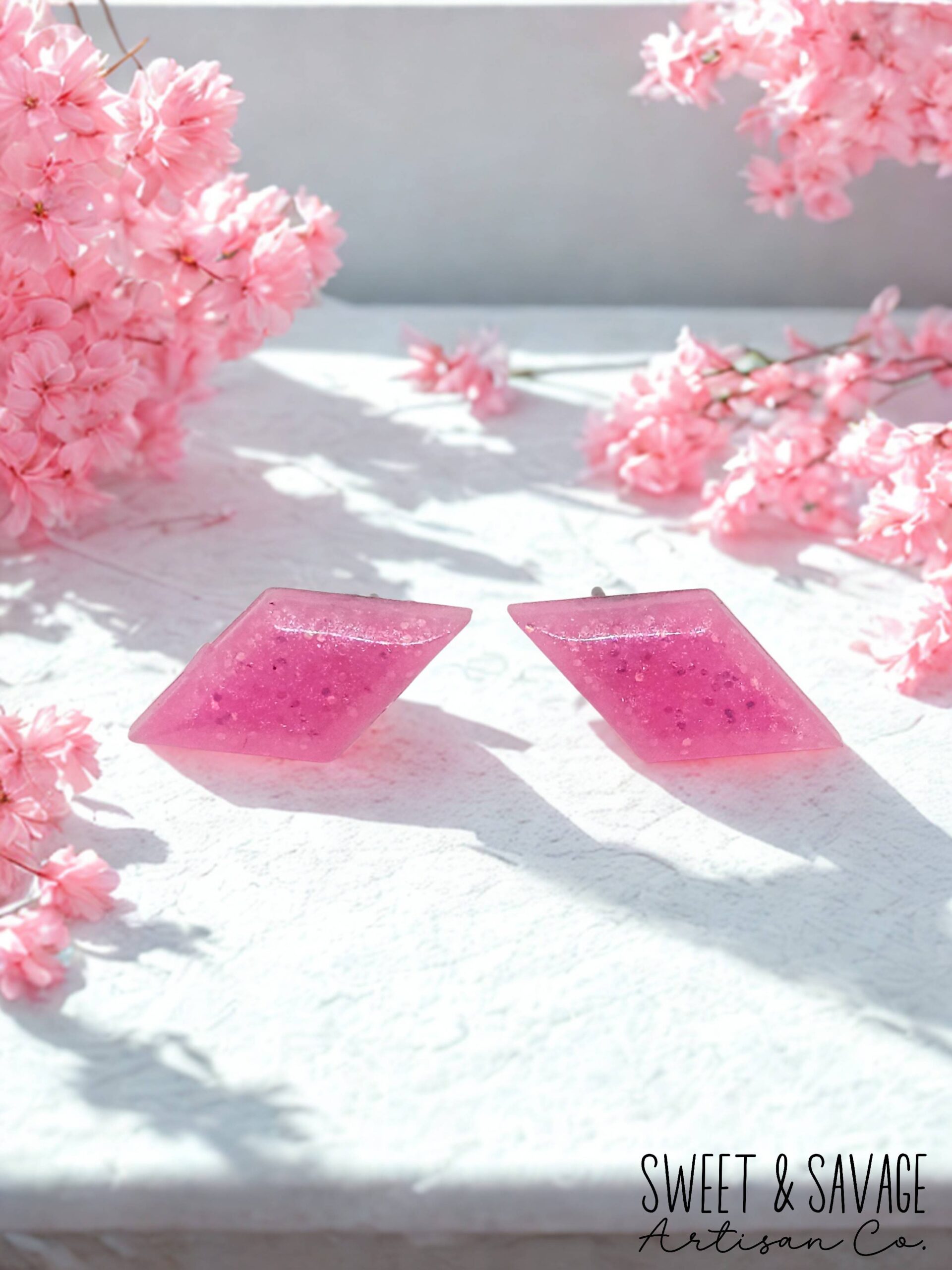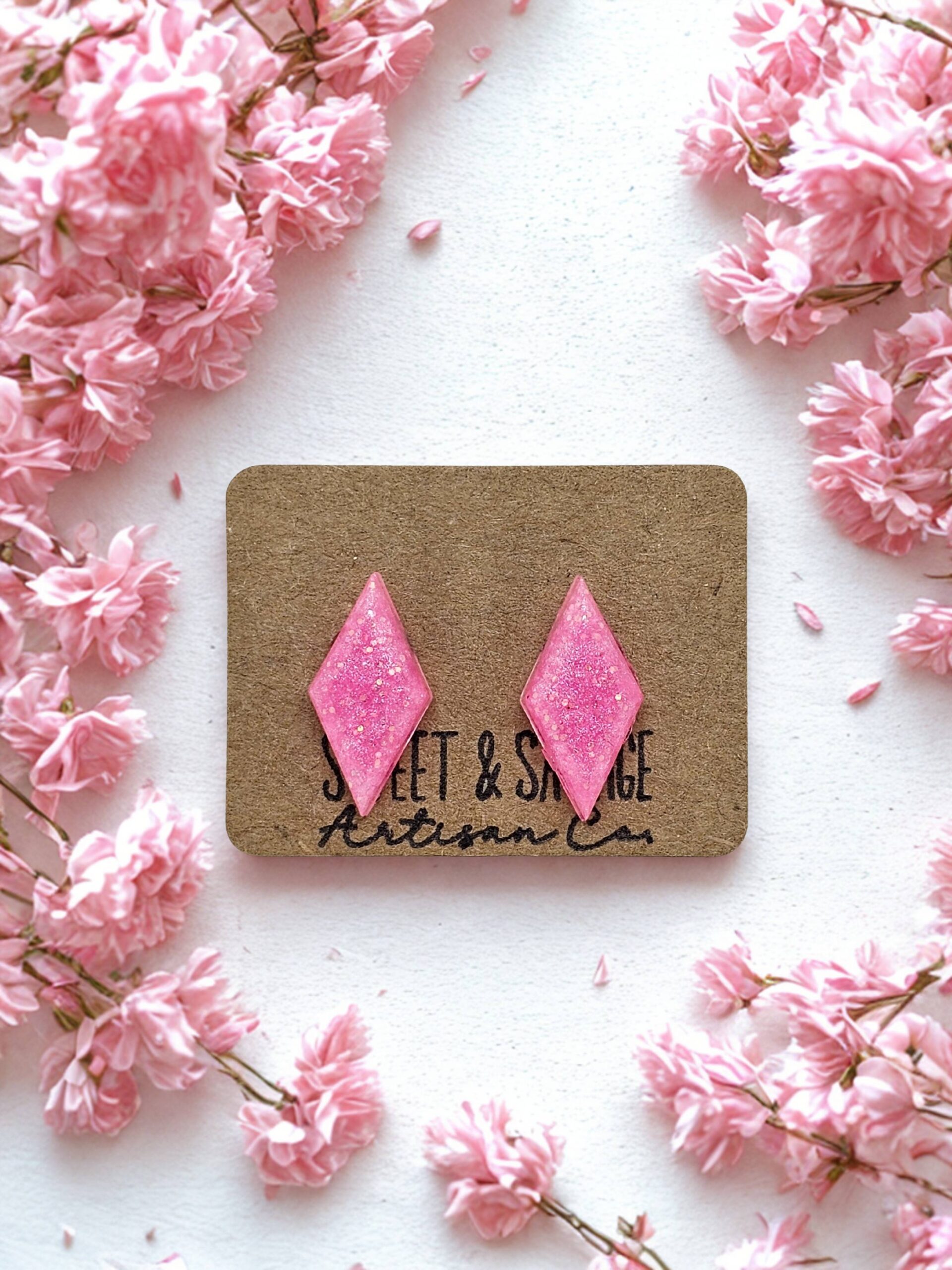 Handmade diamond shape gem stud earrings with glitter accents. Beautiful pink looks very chic and perfect for everyday wear.