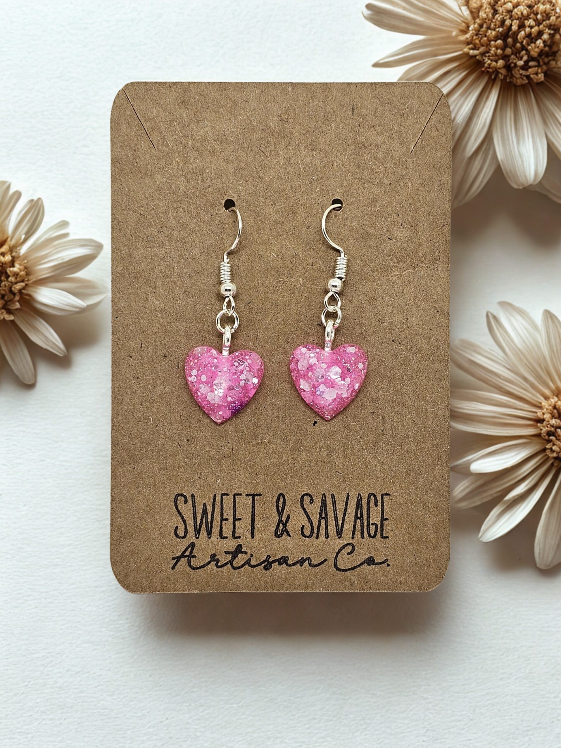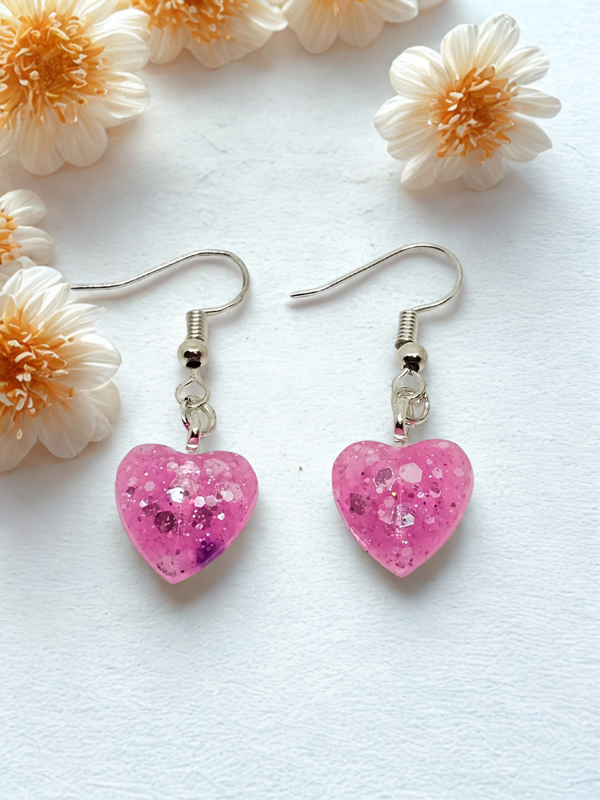 Pink heart-shaped gem dangles with glitter finish