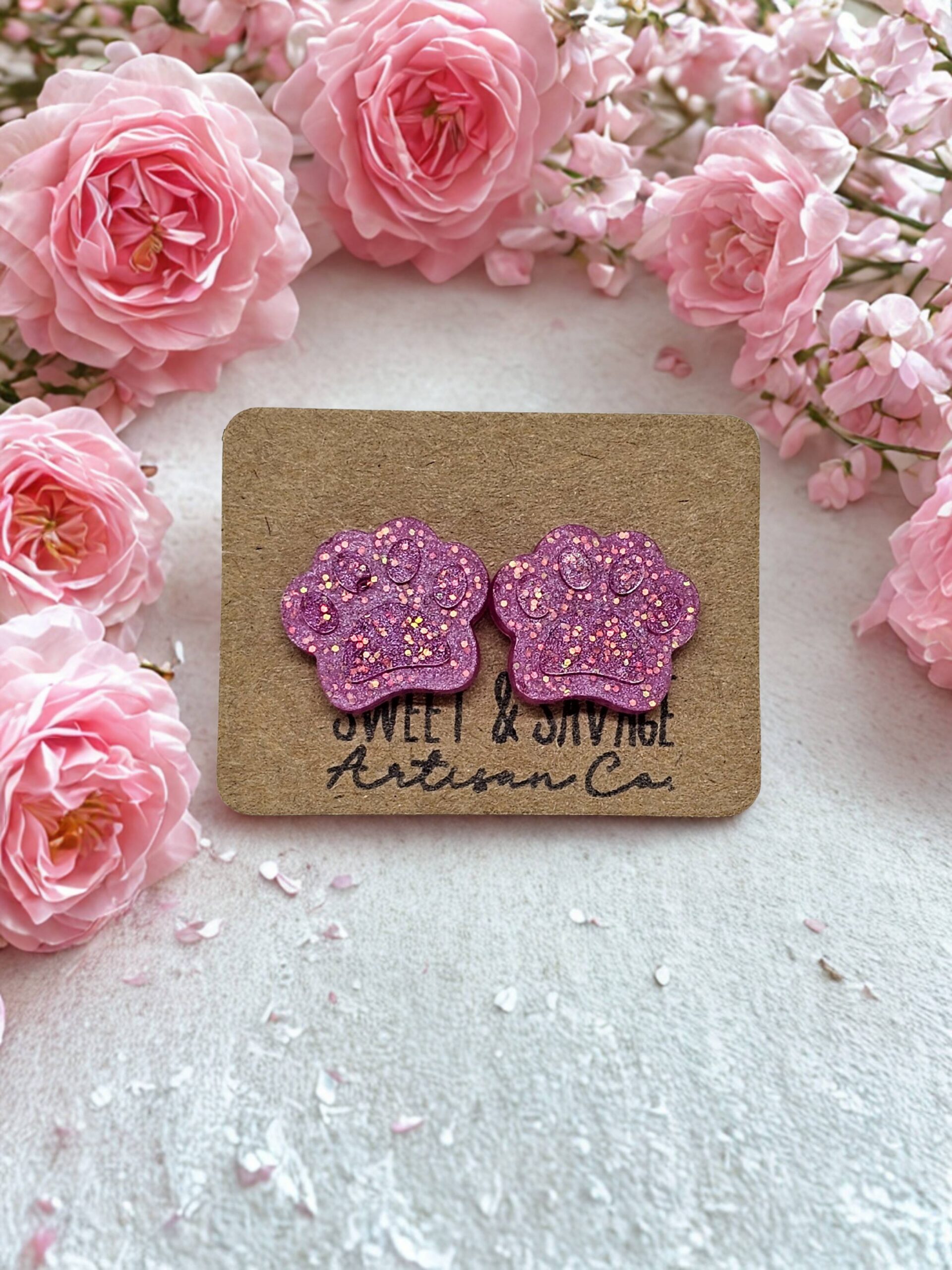 Handmade paw print stud earrings with glitter and holographic accents. Gorgeous pink color that would be perfect to wear everyday.