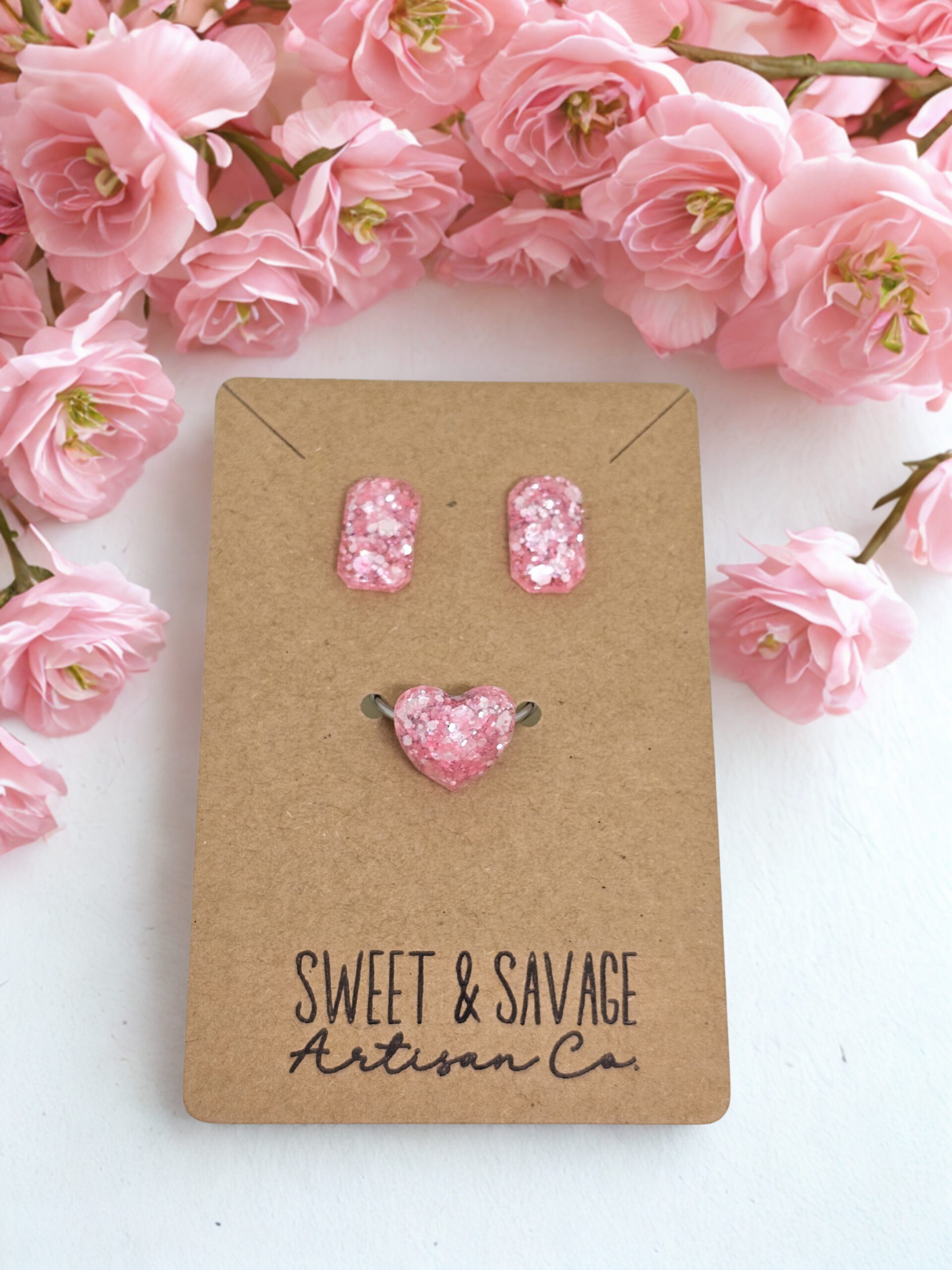 Add a touch of soft glam to your everyday style with this handcrafted pink sparkle ring and stud earring set. Designed to shine beautifully in the light, this matching set features a dreamy pink hue with embedded shimmer for an elegant yet playful look.
