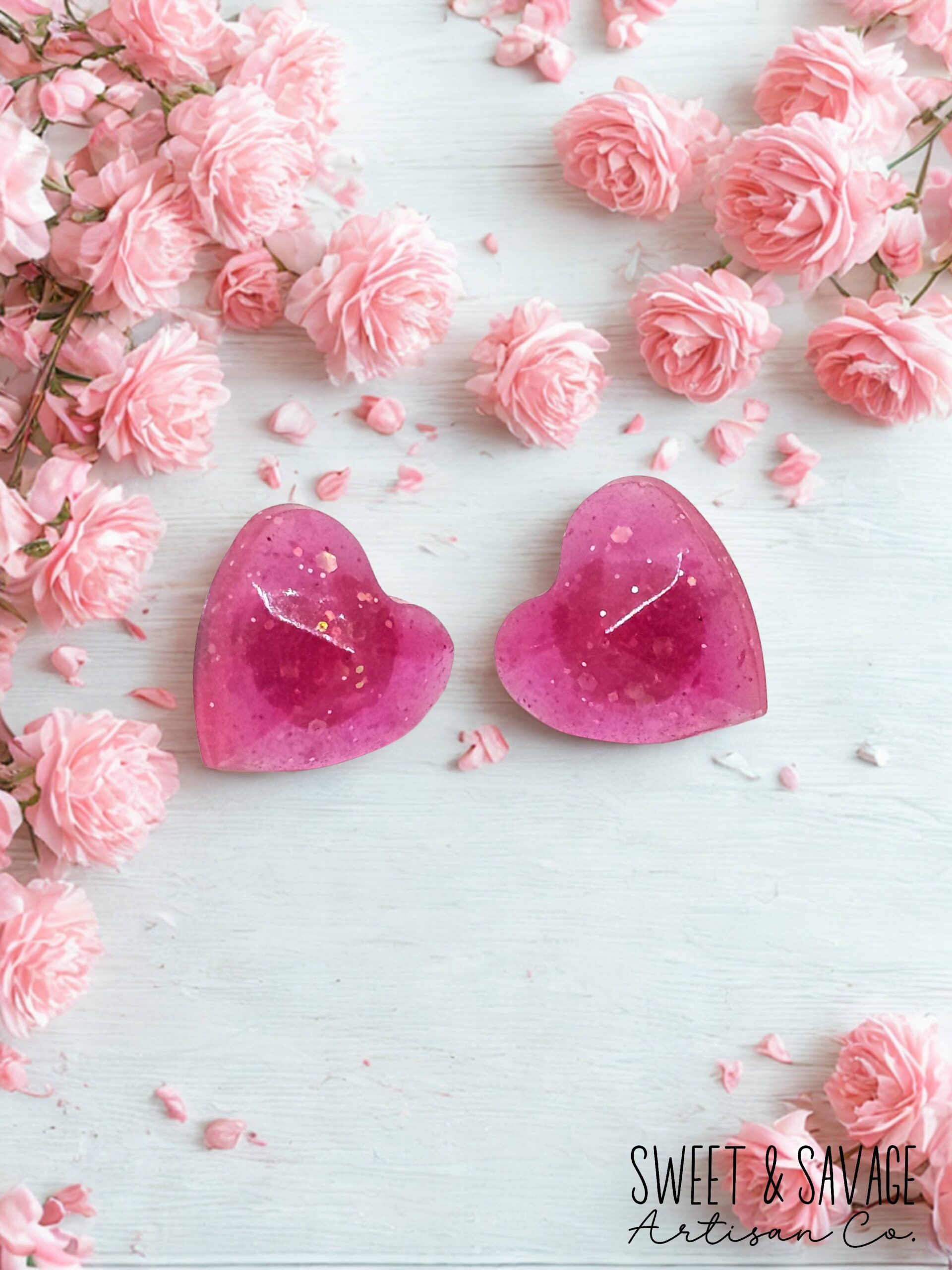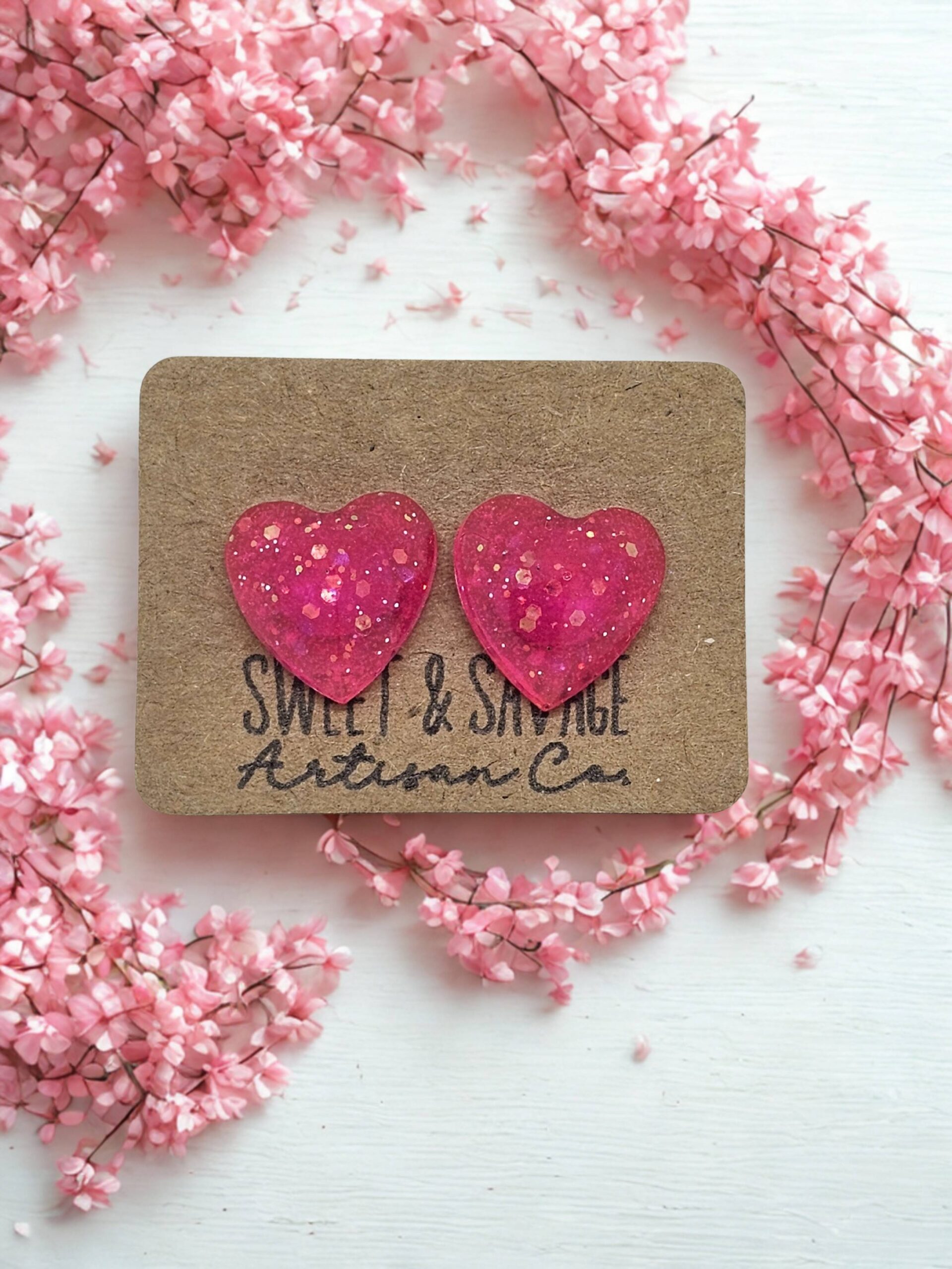 Handmade pink heart gem stud earrings with glitter accents. Has a translucent appearance at some angles.