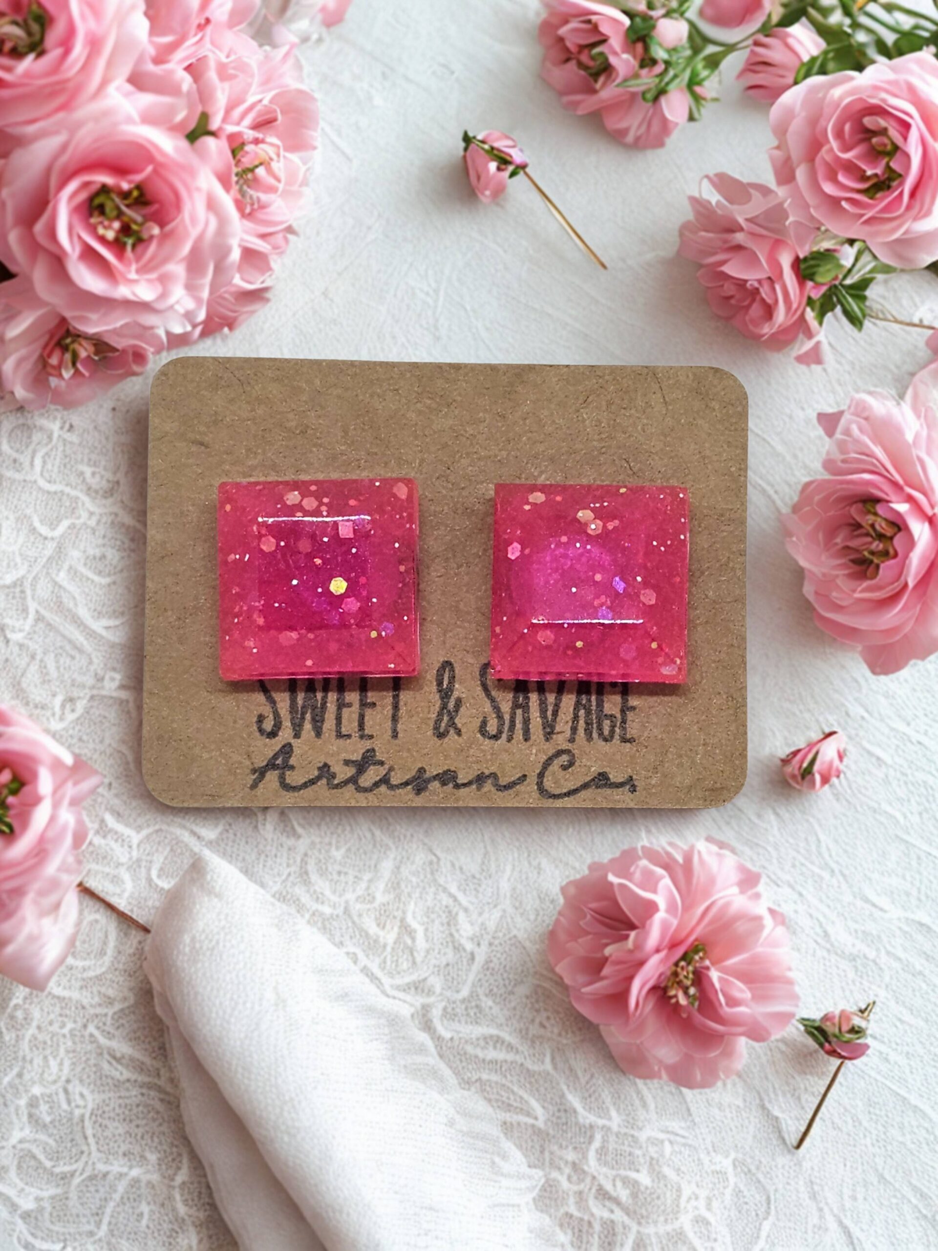 Handmade pink square gem stud earrings with glitter accents.  Has a translucent appearance at some angles.