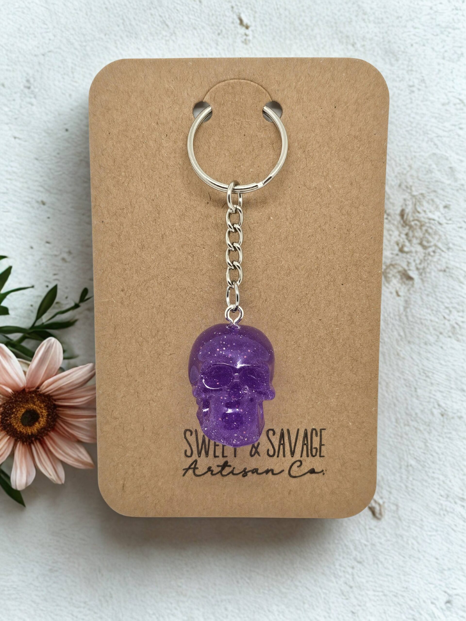 Bold, edgy, and handcrafted with care – this resin skull keychain is the perfect accessory for those who love gothic, alternative, or statement styles. With its purple finish and glittery shine, this skull adds a touch of elegance to your everyday carry.