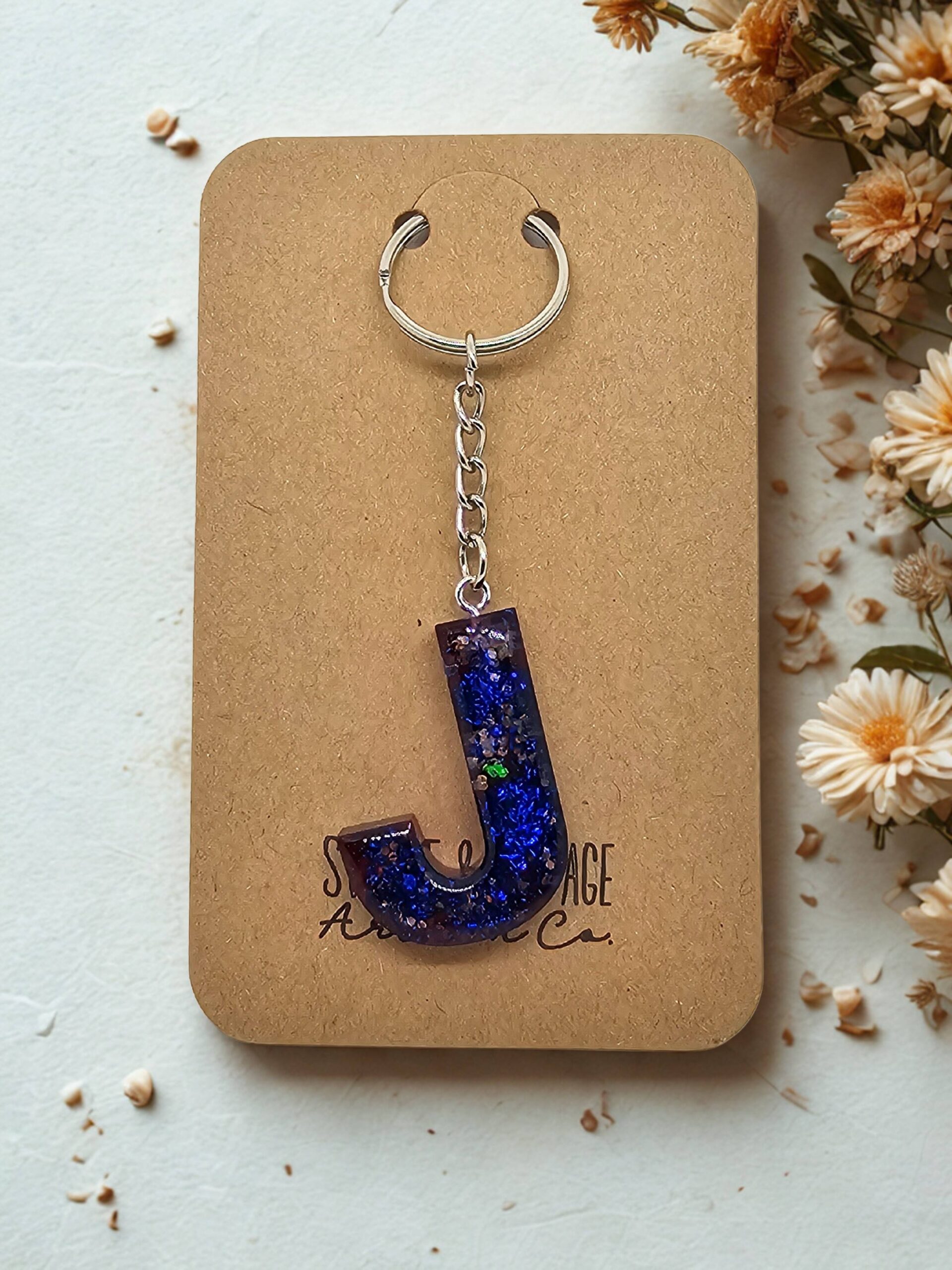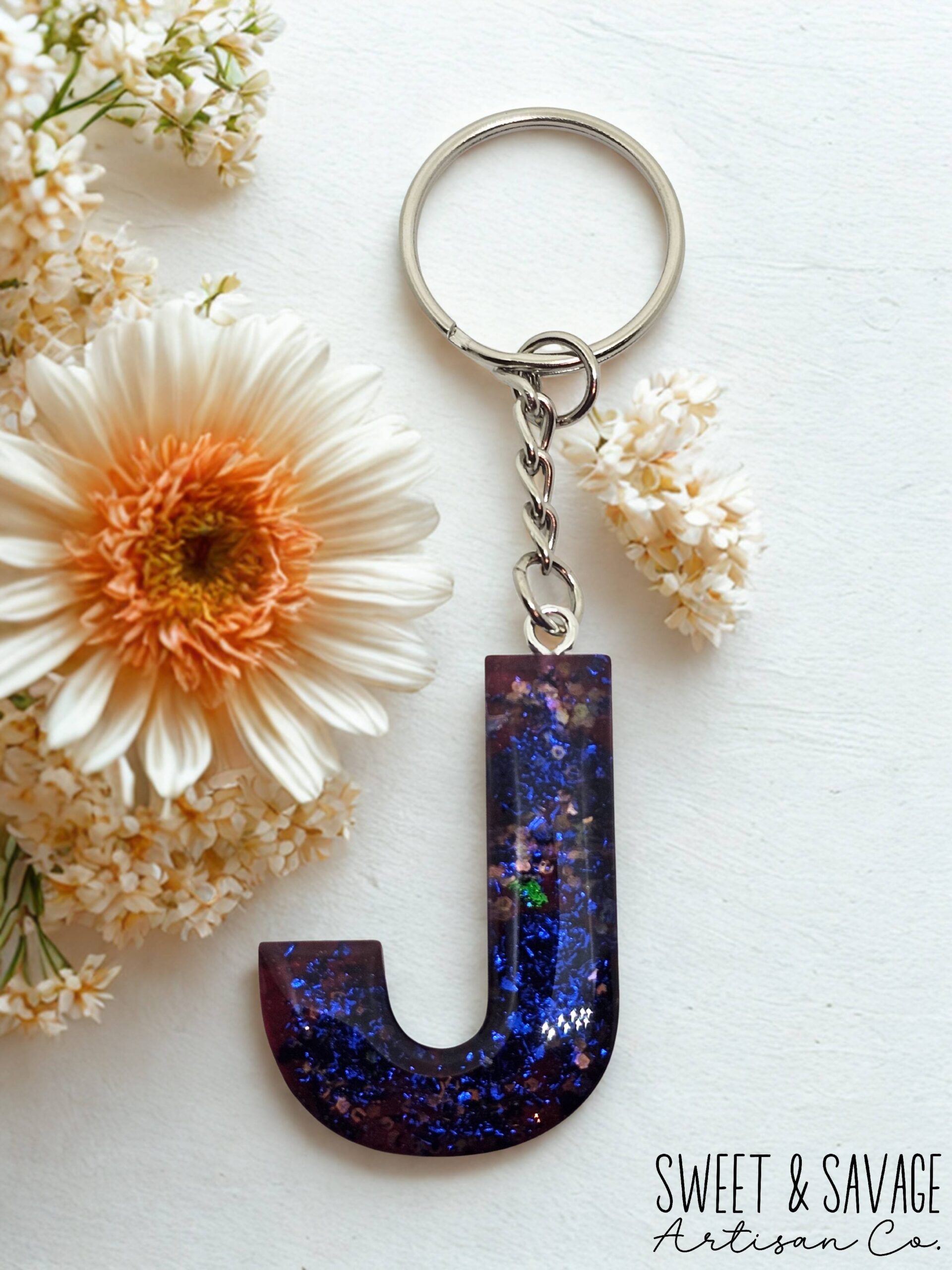 Handmade initial keychain – Letter J. Red and blue with glitter accents.