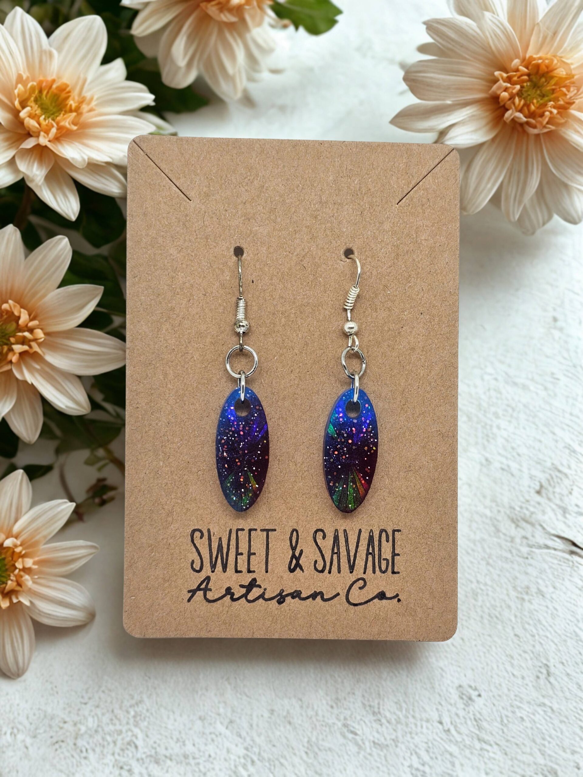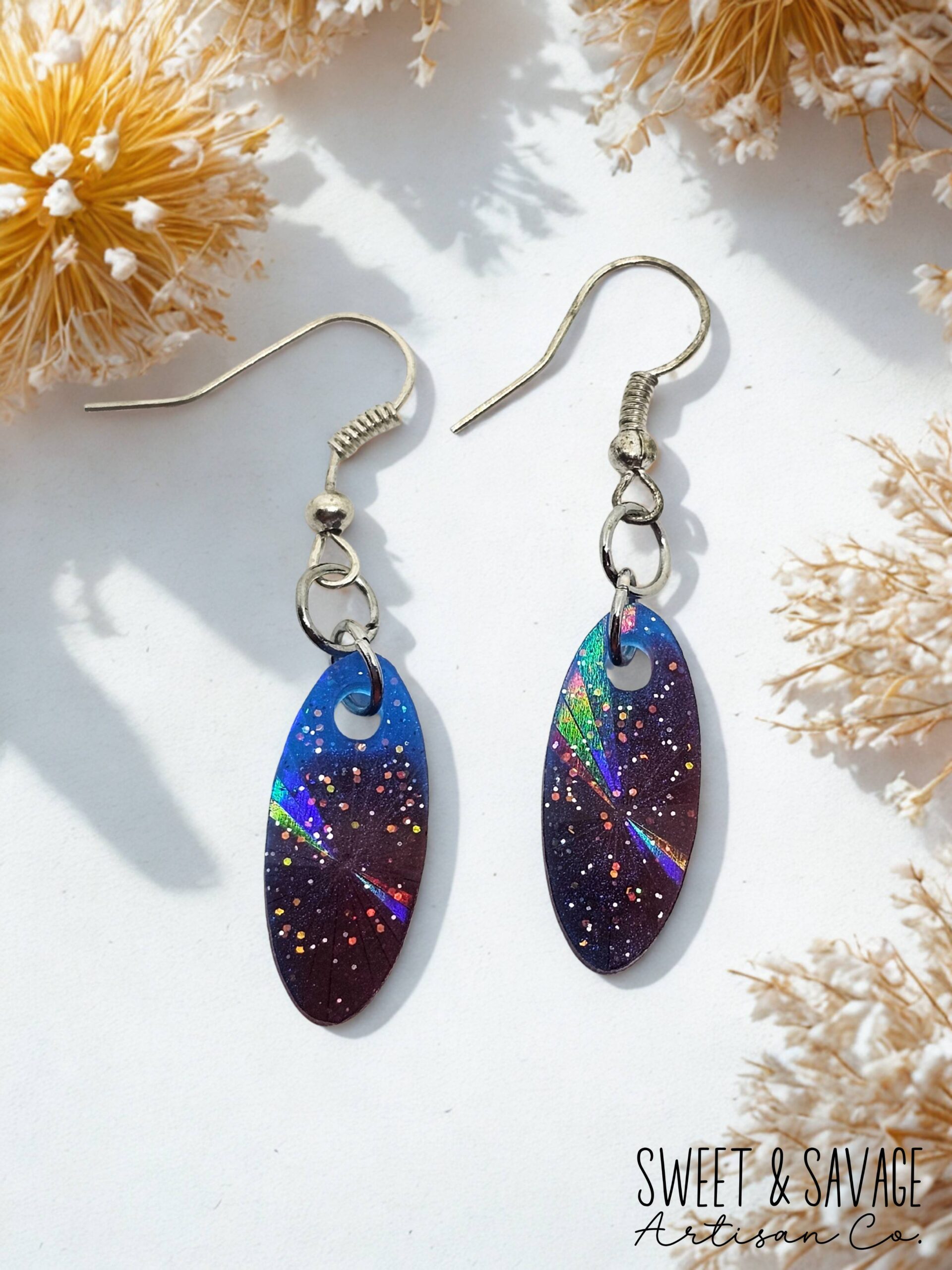 Handmade oval dangle earrings with glitter and holographic accents. Gorgeous red and blue colors that would be perfect for your patriotic outfits or just to wear everyday.