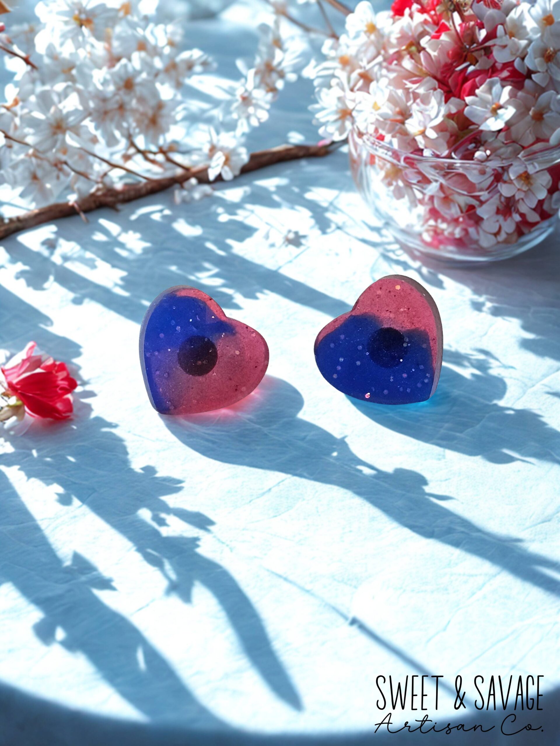Handmade heart stud earrings with glitter and holographic accents. Gorgeous red and blue colors that would be perfect for your patriotic outfits or just to wear everyday.