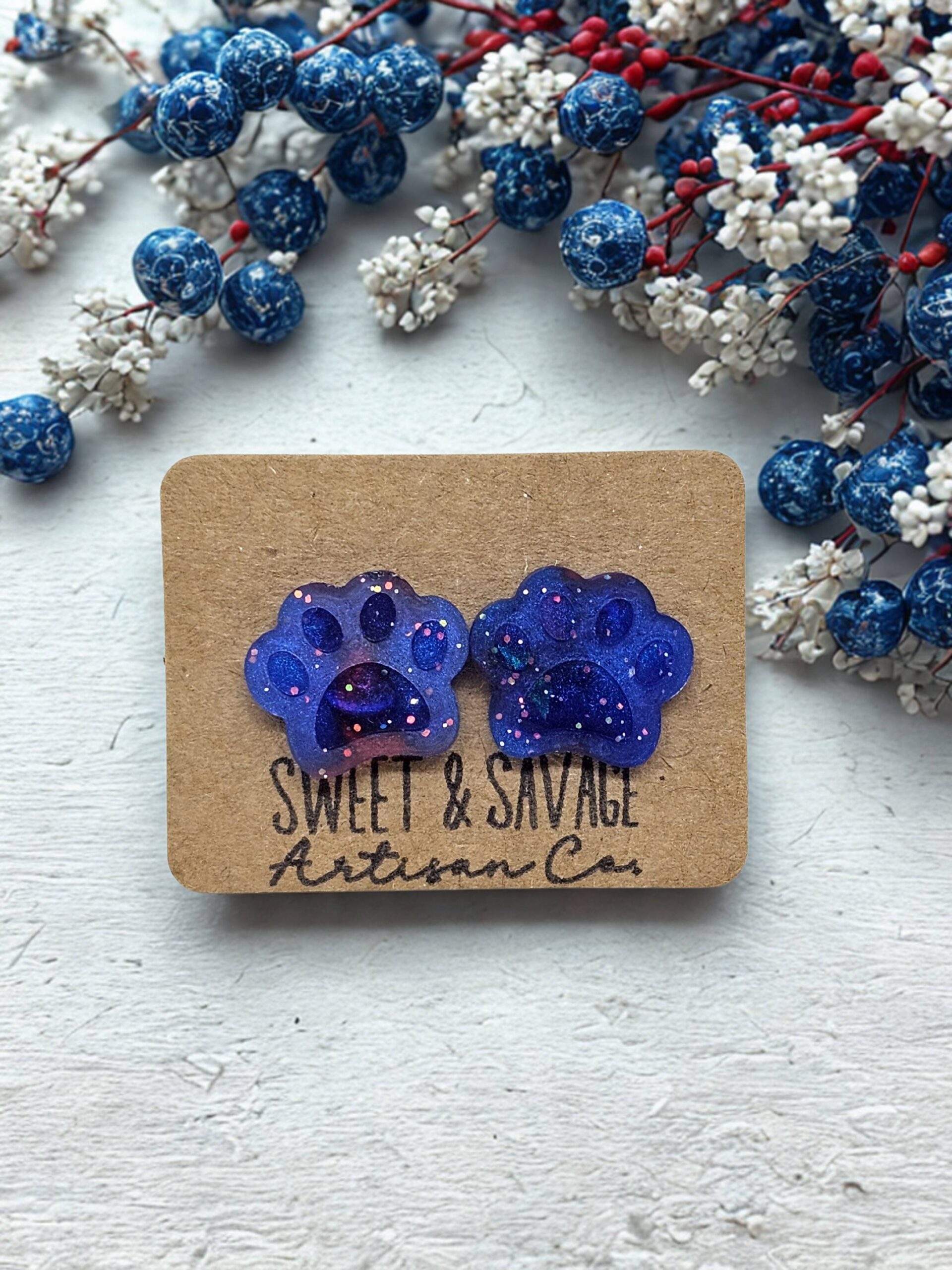 Handmade paw print stud earrings with glitter and holographic accents. Gorgeous red and blue colors that would be perfect for your patriotic outfits or just to wear everyday.