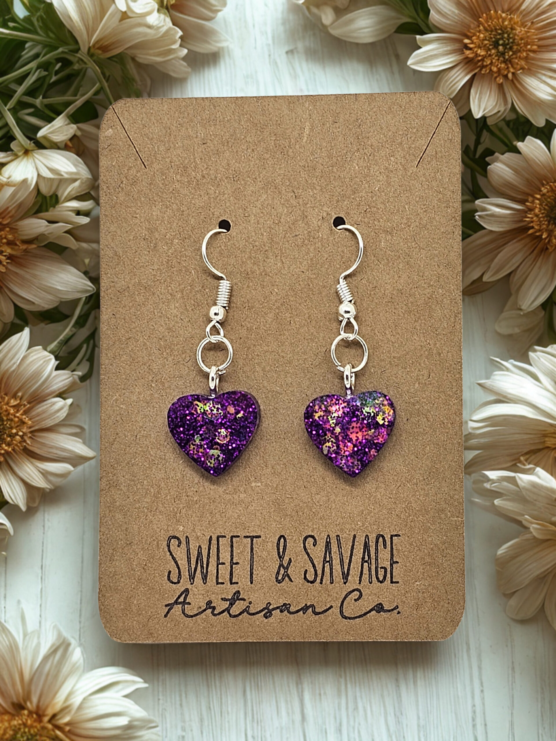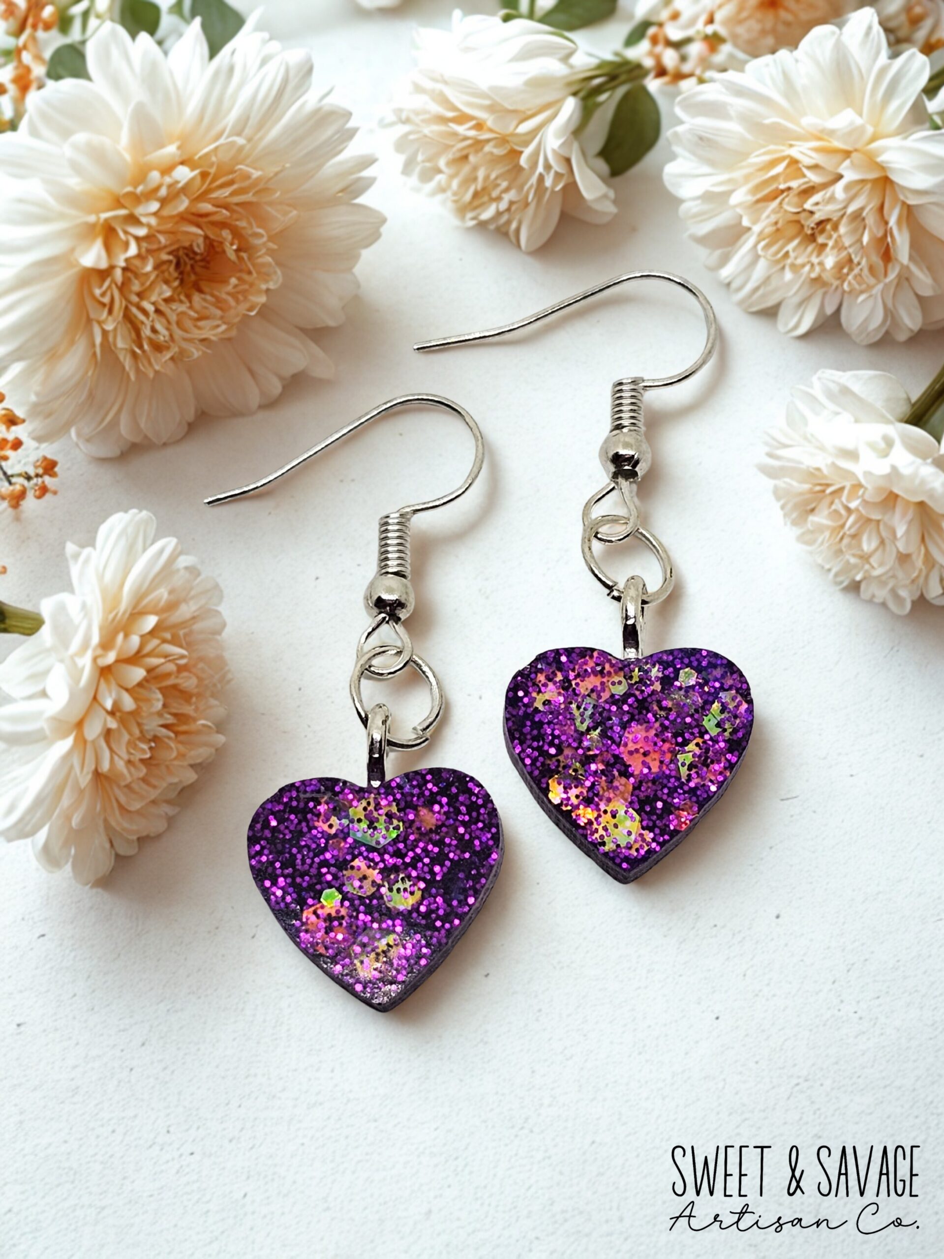 Add the perfect pop of sparkle to your look with these gorgeous purple resin heart earrings. Designed with a rich, vibrant purple base and eye-catching glitter accents, these dangle earrings shimmer beautifully in the light.