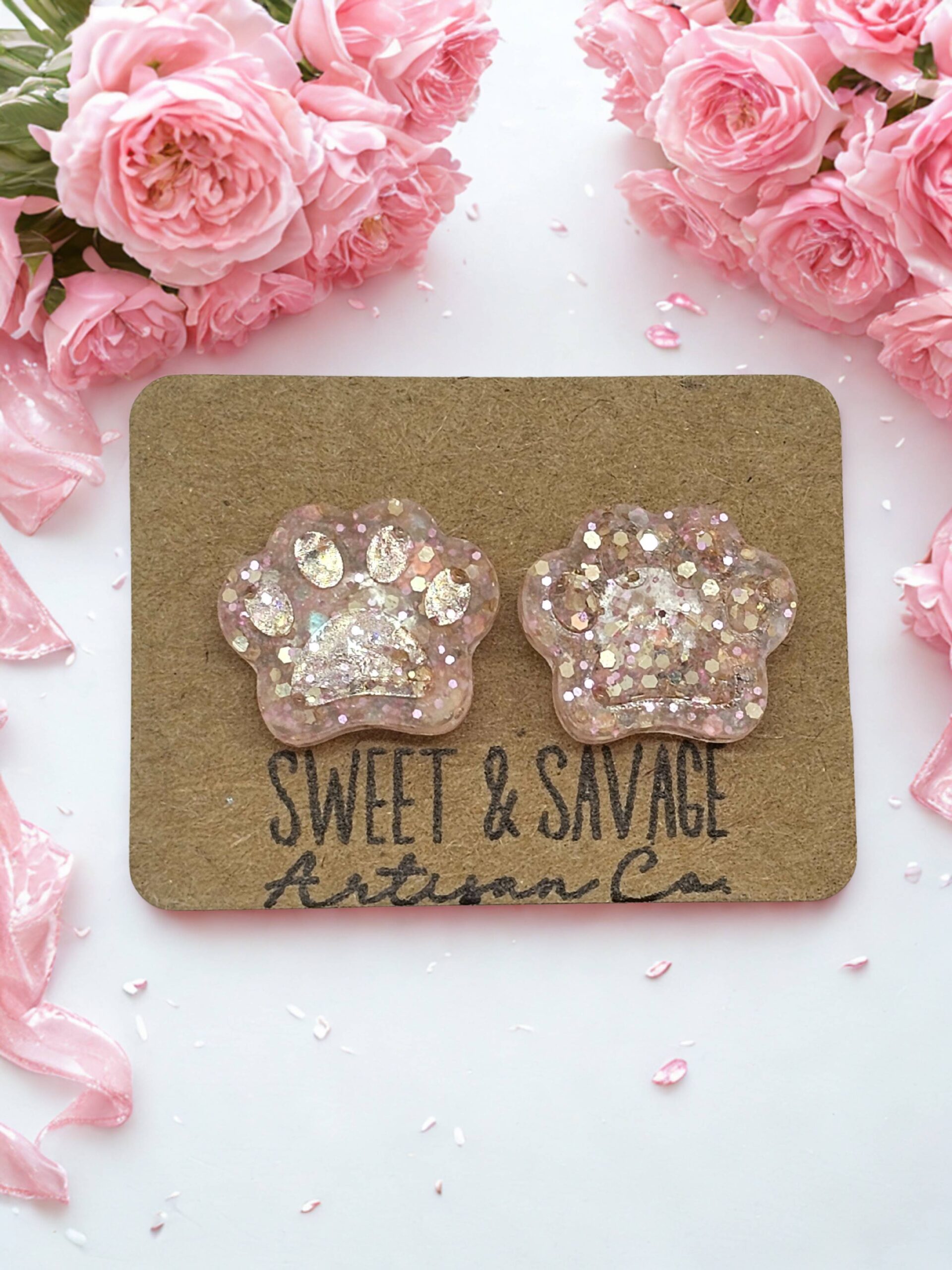 Handmade paw print stud earrings with glitter and holographic accents. Gorgeous translucent rose gold color that would be perfect for your everyday wear.