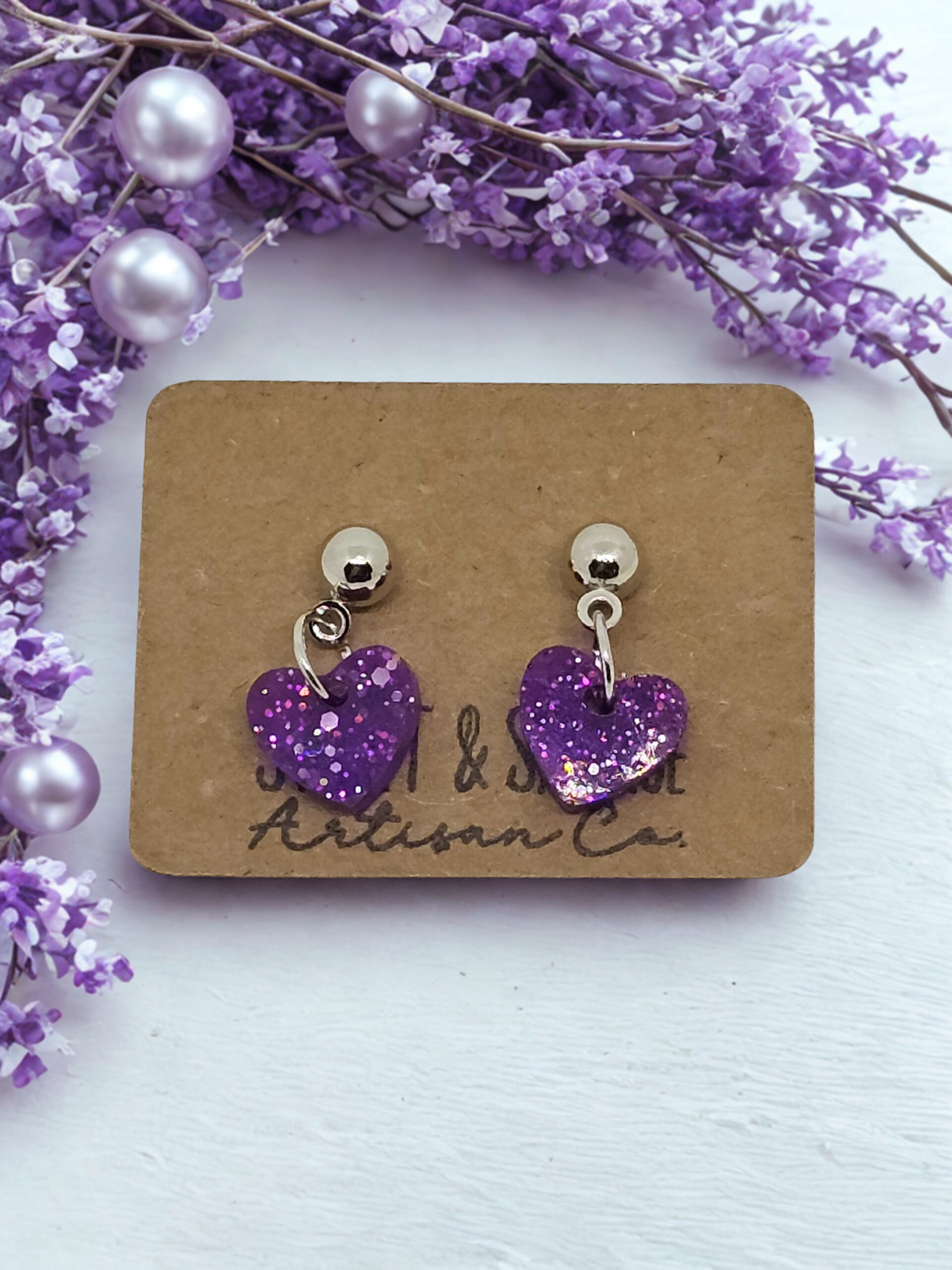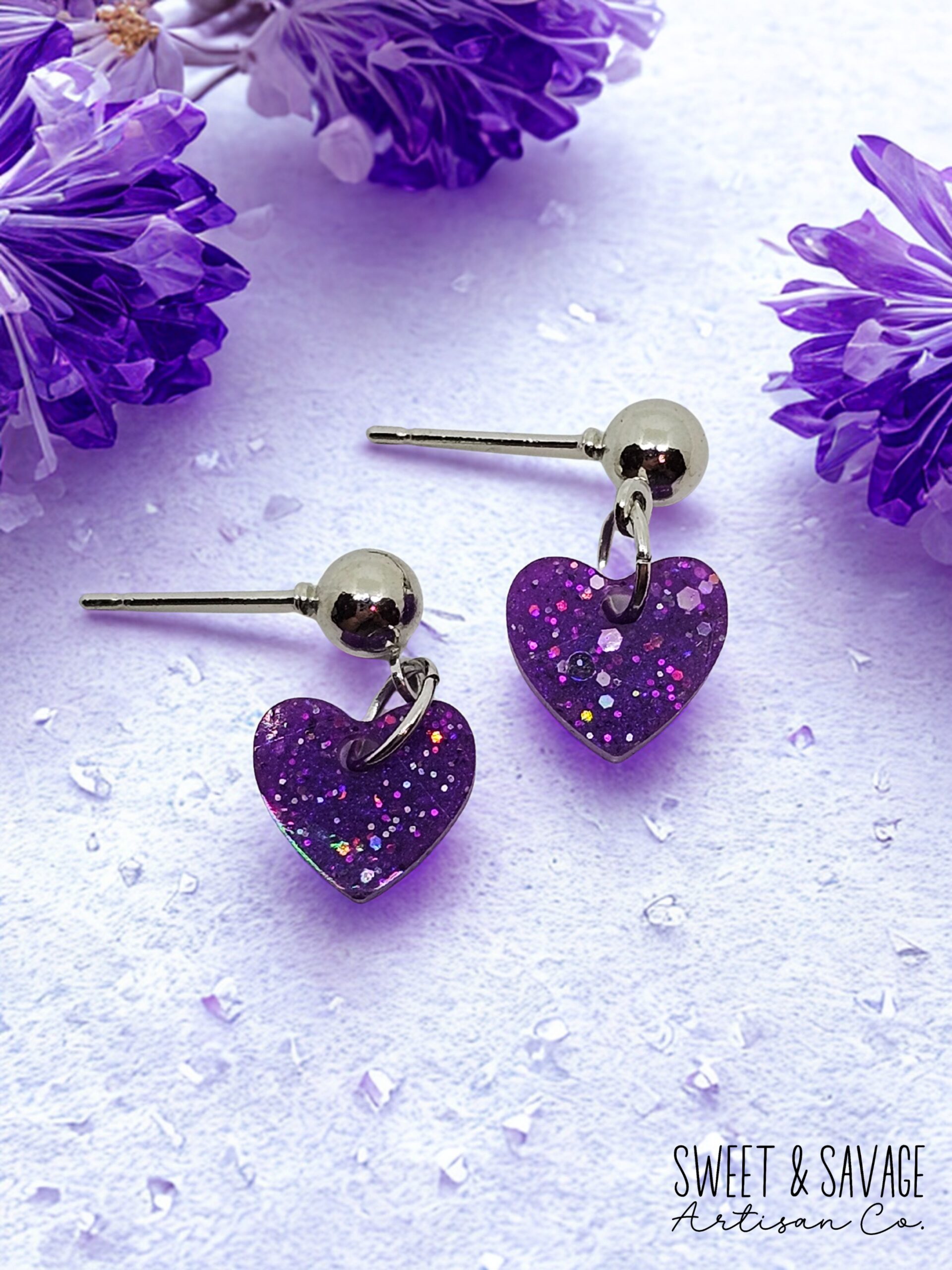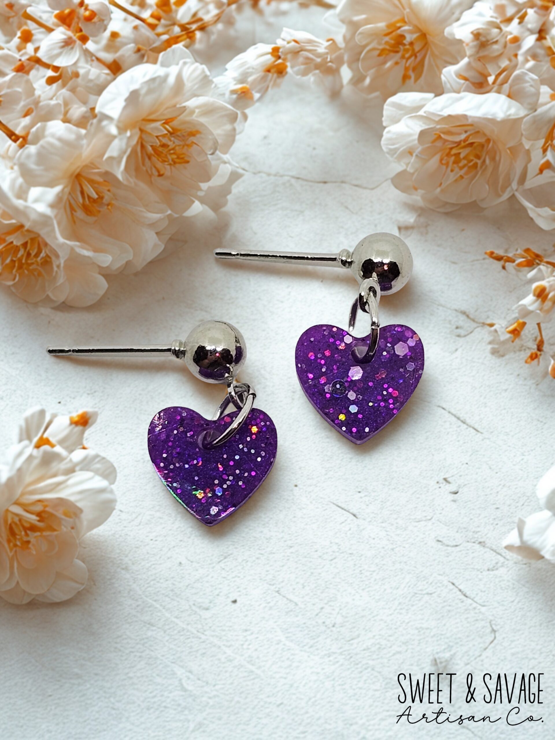 Our Violet Stardust Heart Dangle Stud Earrings feature rich purple glitter hearts that catch the light from every angle. The multidimensional shimmer creates a dazzling effect, making these earrings perfect for both daytime charm and evening glow.