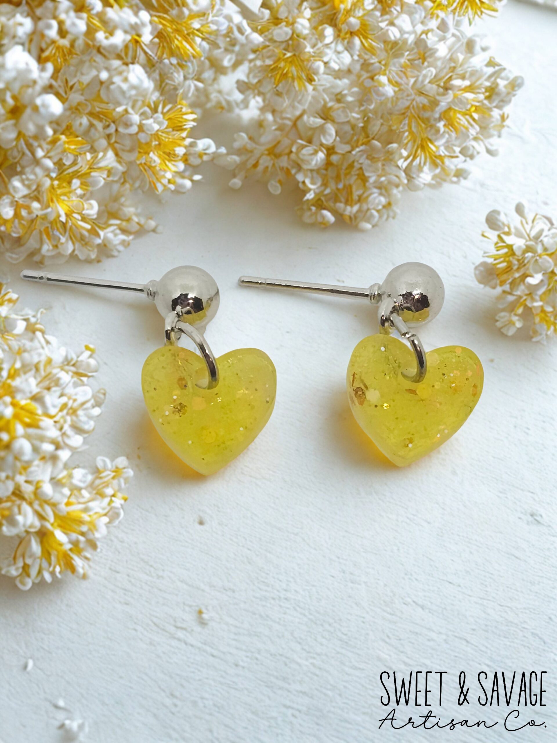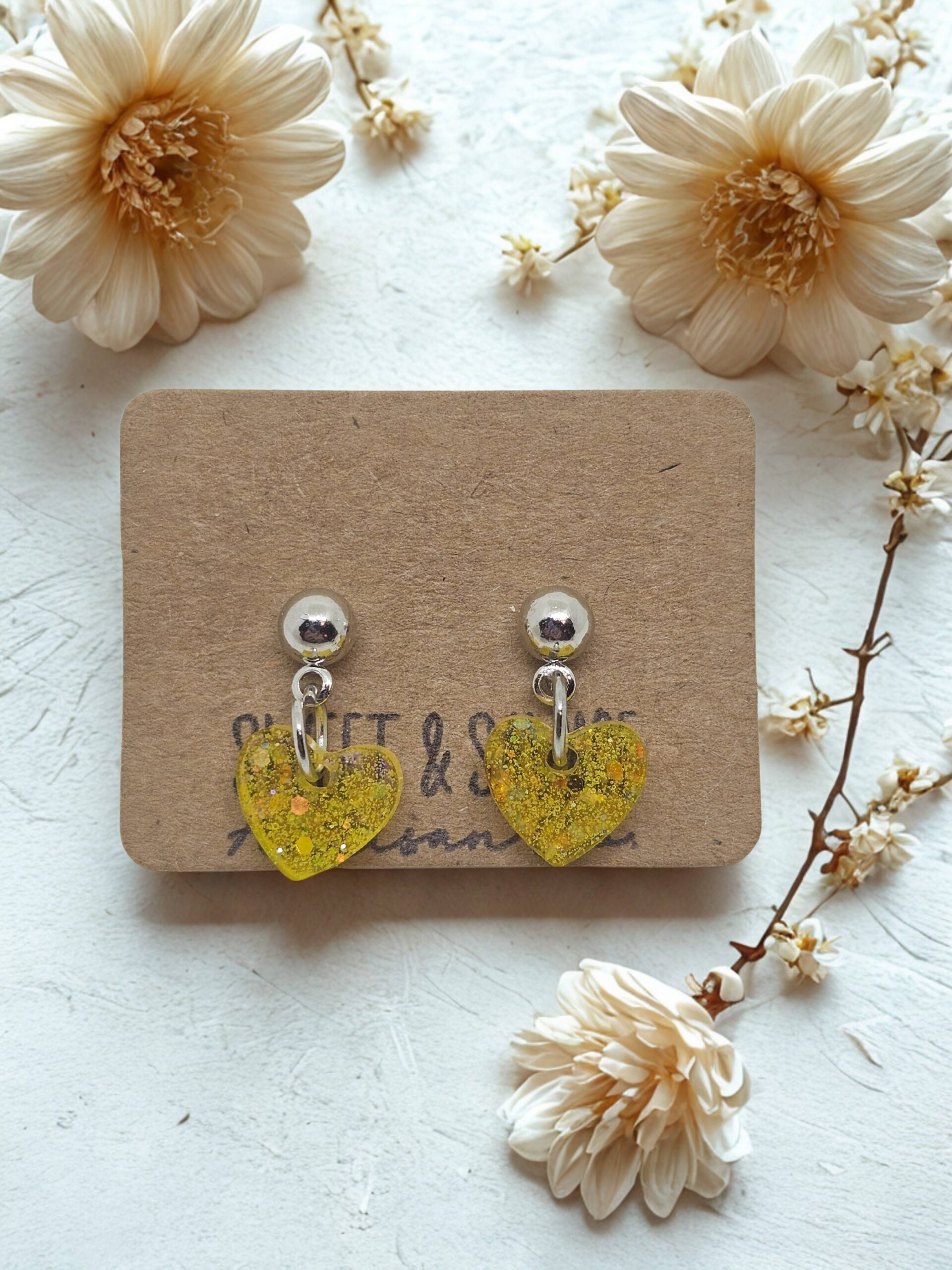 Add a cheerful pop of color to your jewelry collection with these handmade yellow glitter heart stud dangle earrings. Featuring translucent resin heart charms filled with sparkling glitter, these earrings catch the light beautifully while remaining lightweight and comfortable for everyday wear. Finished with classic silver-tone ball studs, theyāre perfect for adding a sweet, playful touch to any outfit.